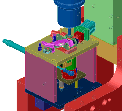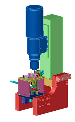 The fixture shown below preloads a spring and checks for the presence of several features including two tapped holes at the same time that it peens the rivet of a automotive hood latch.