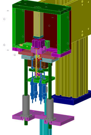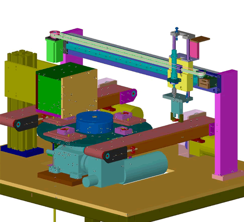 The test station shown below tests the signal quality of the transmitter in an automotive remote lock controller. Power is applied to the battery terminals of the keyfob circuit board, while air cylinders coupled to sprung dampers actuate the fragile switches. The whole mechanism is surrounded by electro magnetically shielding box while the test proceeds. Due to the complexity of the electronic component of this tester, this project was a collaboration of three separate companies located in different countries. The picture to the right shows the complete machine of which the testing station is part.